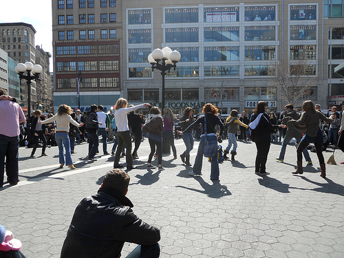 ניסוי בהתארגנות קהילתית. פלאש מוב ביוניון סקוור לשימוש באמנות אוונגארדית ותיאטרליות כאקטים של מחאה פוליטי במרחב הציבורי יש היסטוריה עתיקה, מימי המהפכה הצרפתית ועד לתנועות ה-Yippis בארה"ב או "גרילת הכיף" במערב גרמניה בשנות ה-60. בשני המקרים האחרונים, תנועות סטודנטים אחרות שדבקו באמצעי המחאה המסורתיים התייחסו ל"תעלולי הרחוב" בזלזול והחשיבו את מארגניהם להדוניסטים. גם הפלאשמובים של המאה ה-21 התקבלו על ידי התקשורת המסורתית והאקדמיה בצורה דומה למדי: הם הוצגו כמתיחות רחוב האופייניות לתרבויות נוער נרקסיסטיות, שיקוף של מנטליות-עדר, פעולות סתמיות המדגישות מופעי ראווה על פני מהות בעידן הפוסט מודרני או סתם בידור. ברוח זו, השיח אודות הפוטנציאל הפוליטי הגלום בתרבות הפופולרית ברשת ובפלאשמוב כניסוי בהתארגנות קהילתית, עדיין שולי ובראשיתי.